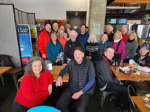 lunch or apres ski. We do give each rider some colored streamers to let people know they are from the bus. Some are attached to folks' helmets, poles, jacket loops. At lunch they might be draped along the table top - welcoming you to join in, ask questions, say hi.